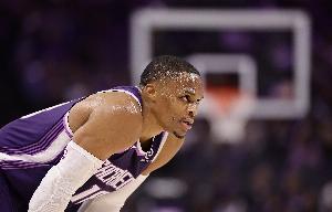 上半场比赛,威少攻防两端依然拼尽全力,投篮手感不佳就冲筐造杀伤,防守端预判抢断,就是失误有些多。