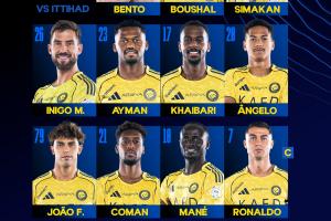 利雅得胜利首发:24- 本托、12-纳瓦夫、3-西马坎、26-伊尼戈·马丁内斯、23-叶海亚、17-哈巴利、20-安吉洛、79-菲利克斯、21-科曼、10-马内、7-C罗